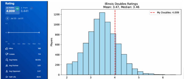 As both a player and Data Analytics professional, I couldn’t resist turning the lens on my own performance. With a DUPR doubles rating of 4.009 as of 7/31/2025, I currently rank in the top 19.9% of rated players in Illinois and in the top 24.7% among men. Within my age group (40–45), I place in the top 25.6% statewide. My rated match record stands at 166 wins and 114 losses, with an average point share of 56.15%, showing consistent competitiveness. While I’m proud of this progress, what excites me most is the growing depth and breadth of talent across Illinois. Whether on the court in Naperville or Chicago, or behind the screen analyzing trends, it’s clear we’re only in the opening chapters of pickleball’s story here.