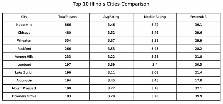 Aggregating players by city reveals that Chicago is not the epicenter of Illinois pickleball. The suburb of Naperville has 866 players, nearly 80 % more than Chicago’s 480. Wheaton, Rockford, Vernon Hills and Lombard follow (full table below). Naperville also has a remarkably active competitive scene: despite having slightly lower average and median ratings than Chicago, its sheer number of players and clubs sets it apart.